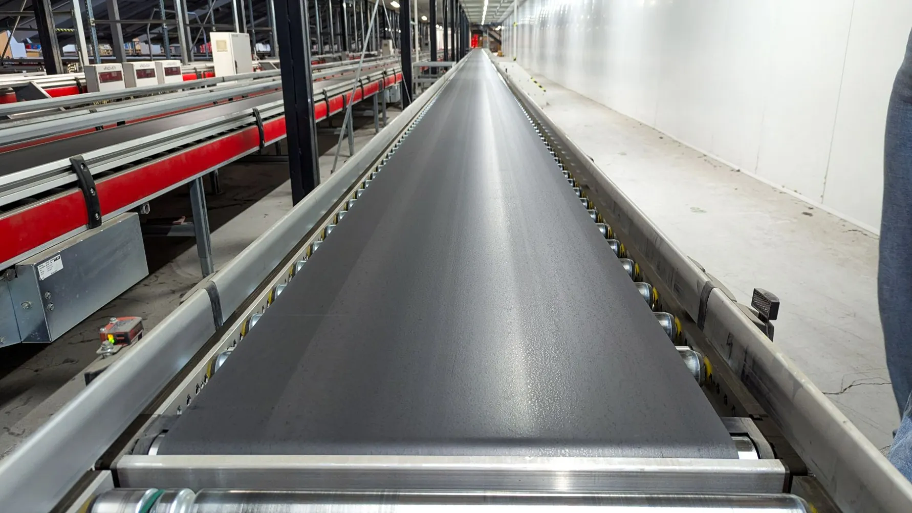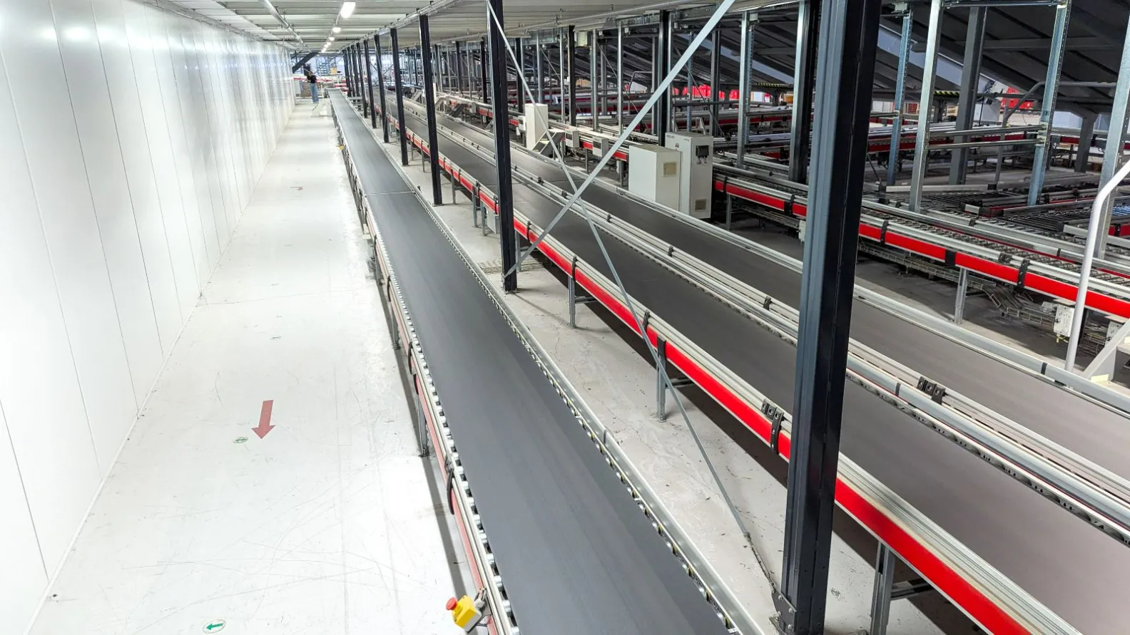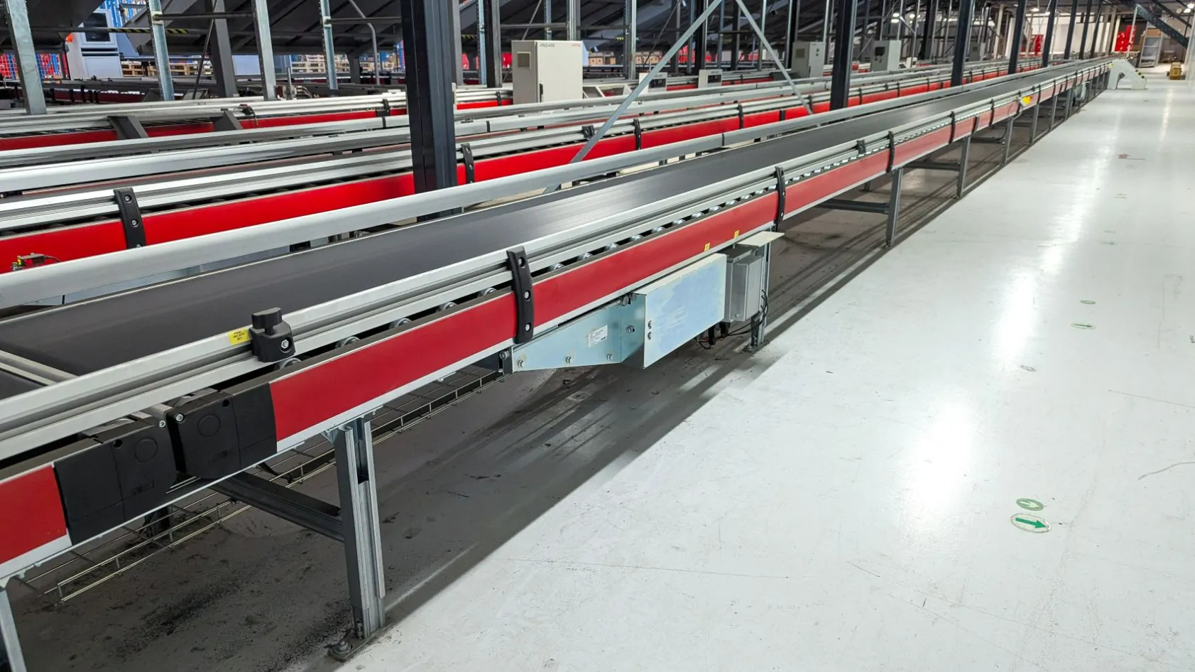 Swisslog lang båndtransportør, 14 meter med 600 mm båndbredde, utstyrt med ruller under båndet for ekstra stabilitet og lav friksjon.