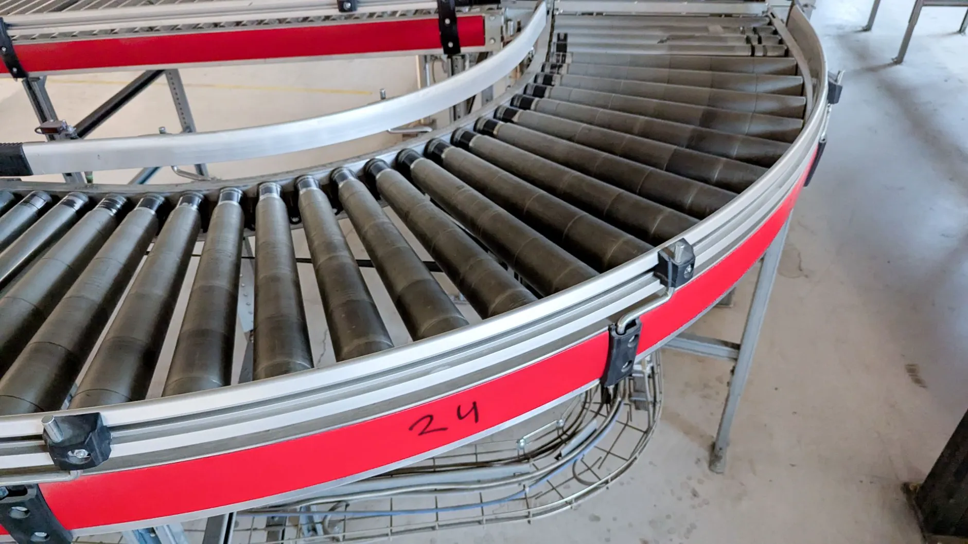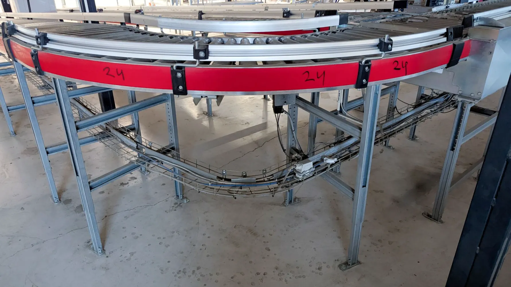 Drevet 90° rullekurve fra Swisslog, designet for effektiv og jevn overgang mellom transportlinjer. Med sin robuste konstruksjon og pålitelige drift sikrer den en jevn flyt selv under høye belastninger.